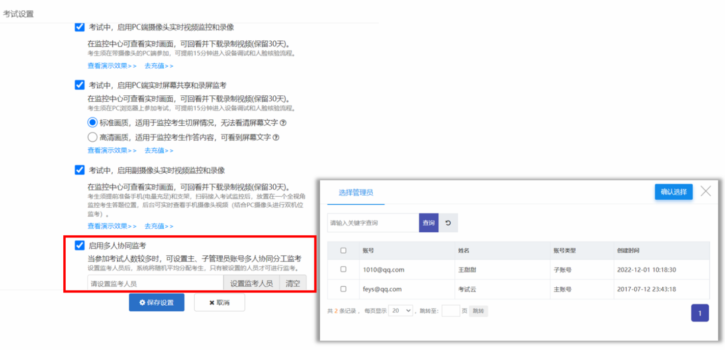 启用多人协同监考——分配不同的监考人员监控不同岗位招聘笔试