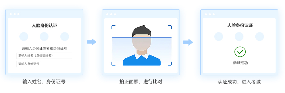 本次岗位招聘笔试是面向全国招聘,应聘者来自各地,为了保证是应聘者本人参加,启用考试云考前人脸实名认证,应聘者需要在进入考试前输入姓名和身份证号,再拍摄正面照,系统会自动核验身份,认证成功才能进入考试。