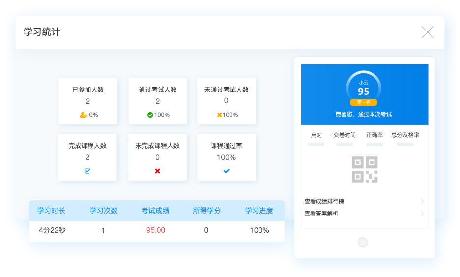 1、学习统计:统计应参加人数、实参加人数、缺席人数通过人数、未完成人数及通过率等;