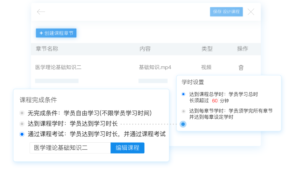 创建课程章节,添加图文、视频、PDF文档等类型的课件,能够设置每个章节的名称和学时。设置课程完成条件,有三种完成条件选择: