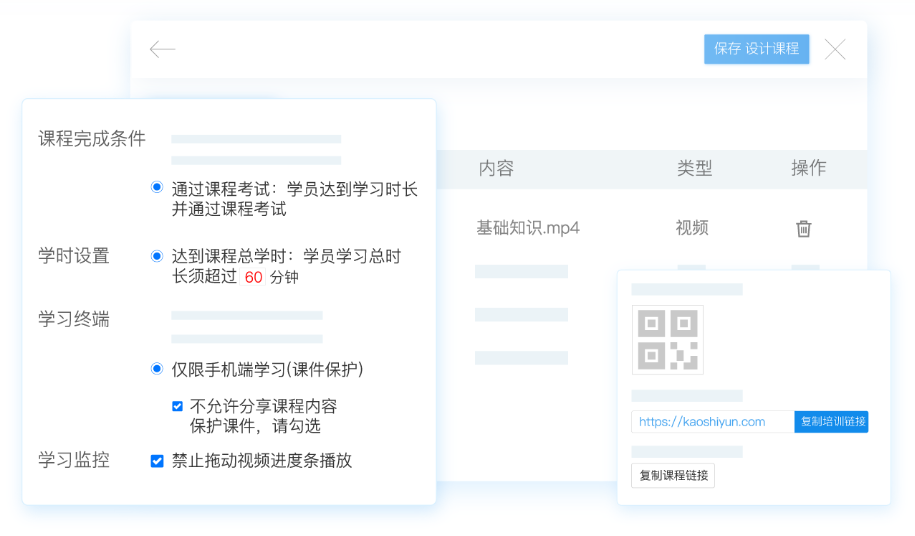 创建线上培训的第二步,设计课程章节、添加课件内容、设置课程参数。