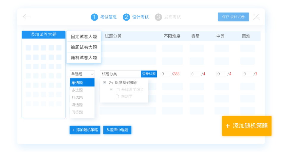 填写考试名称、分类等信息,选择账号登录参与竞赛;再添加试卷大题和试题内容,有固定、抽题、随机大题,三种可以组合使用,能扩大竞赛的难度;之后设置竞赛的时间、次数、答题时间、设备等参数,发布考试,即可通知参赛者在竞赛当天按时参与。