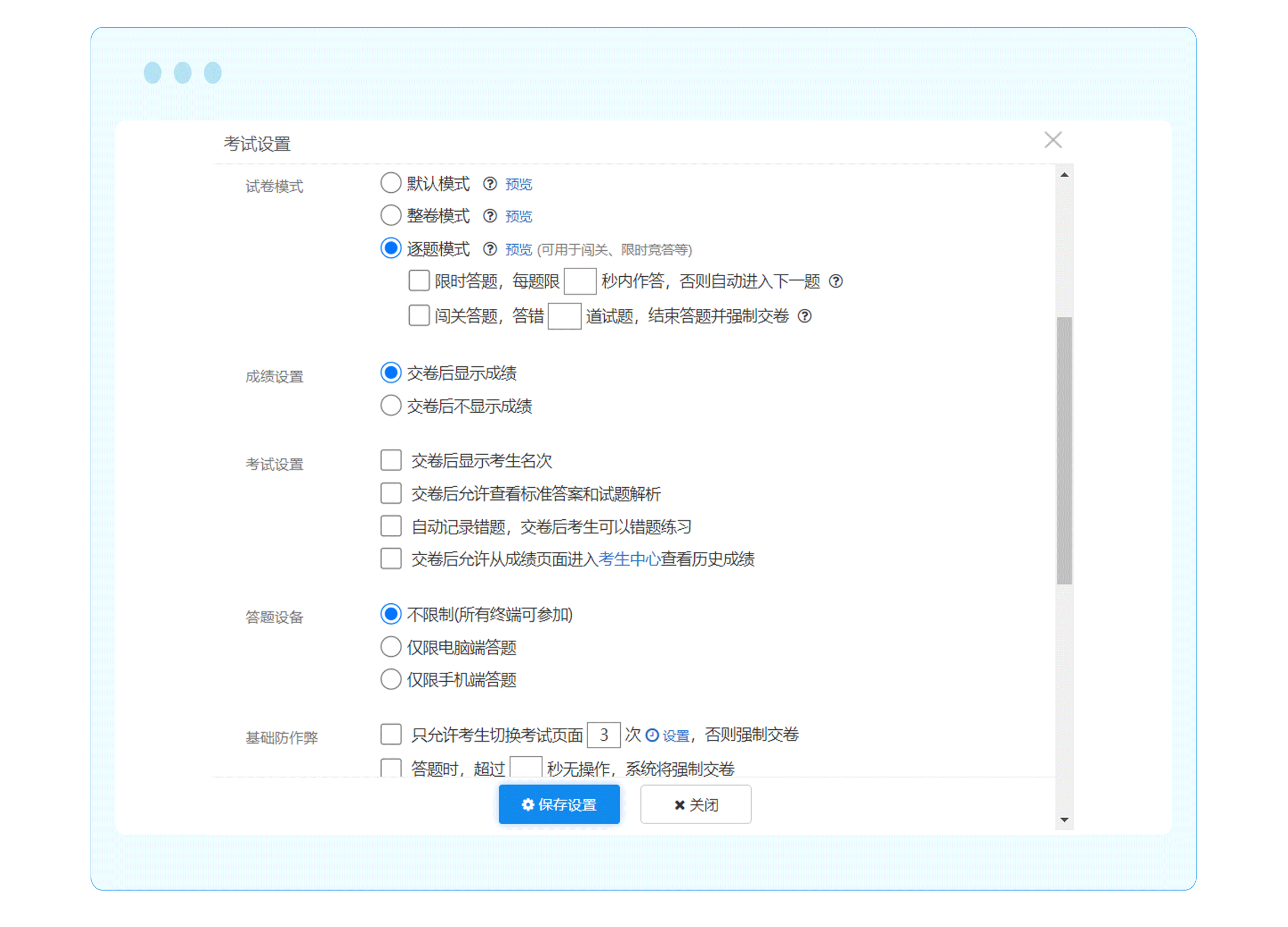 限时可以限制竞赛每道试题的答题时间,超过时间便会进入下一题;闯关答题是给定每位参赛者能够答错的试题道数,答错超过规定的试题道数,系统会自动提交试卷,淘汰参赛者。