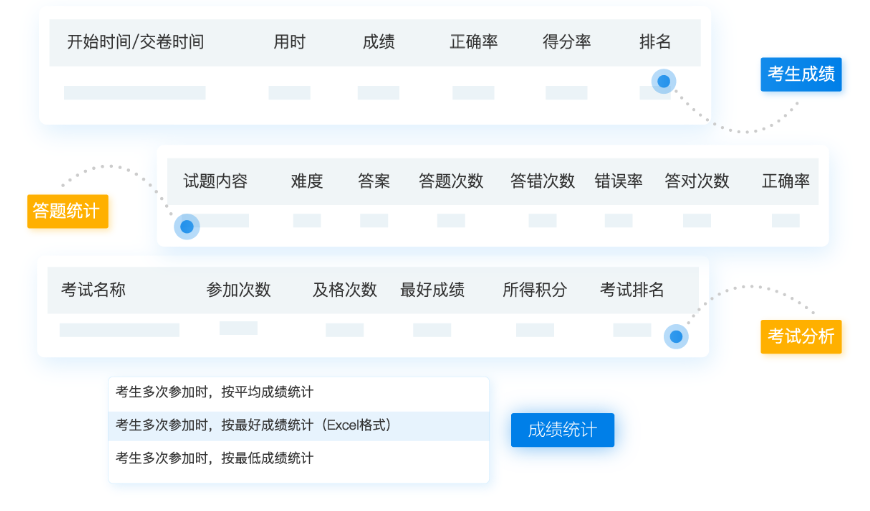 ⑥、统计分析:笔试系统会自动计算考试成绩并生成多维度的考试报告,如考生成绩报表能查看每个考生的成绩、排名等信息;答题统计报表能查看每道试题的答题情况等。