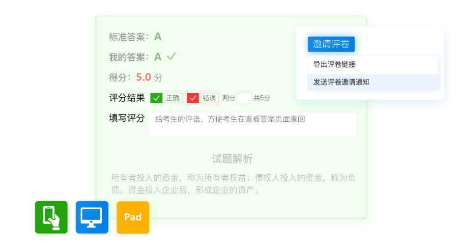 ⑤、智能阅卷:客观题系统智能对比答案,考后自动出分;主观题支持设置关键词自动评分,还可以手动判分或邀请他人协助阅卷。