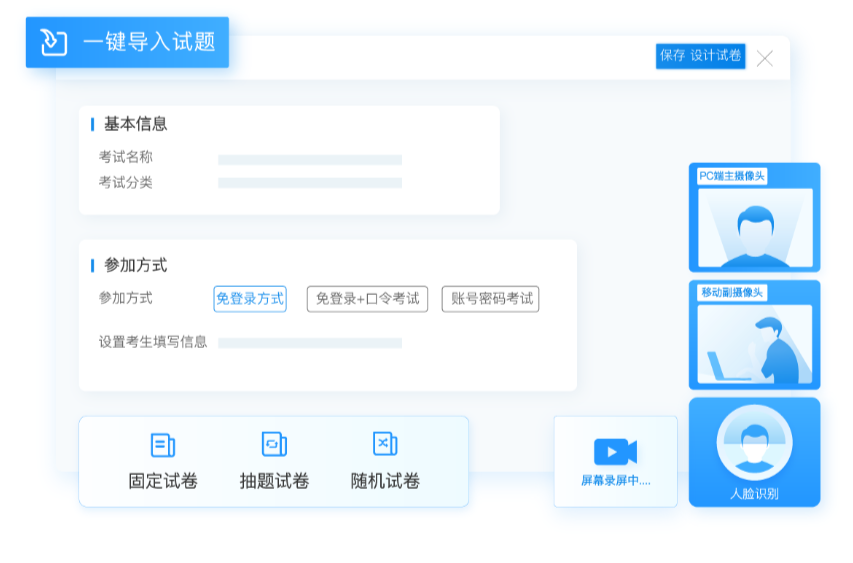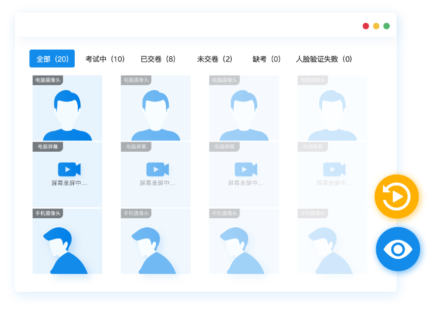 ④、智能防作弊:考试云在线笔试系统有考前人脸实名认证、考试定时抓拍、三路音视频实时监控、防止考生切屏搜索答案、规定时间内无操作自动交卷、禁止考生复制、粘贴等防作弊措施;在考试过程中的所有监考视频都会录制存档,考试结束后可以回看、下载。