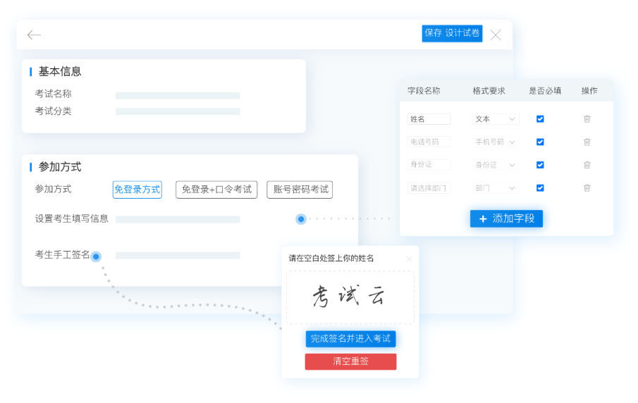 考试云在线笔试系统丰富的试卷类型、完善的防作弊功能、智能数据统计分析,在减少了企业组织笔试所需时间和成本的同时,还能保障人才选拔地公平严肃,并帮助企业快速准确地获取笔试结果。