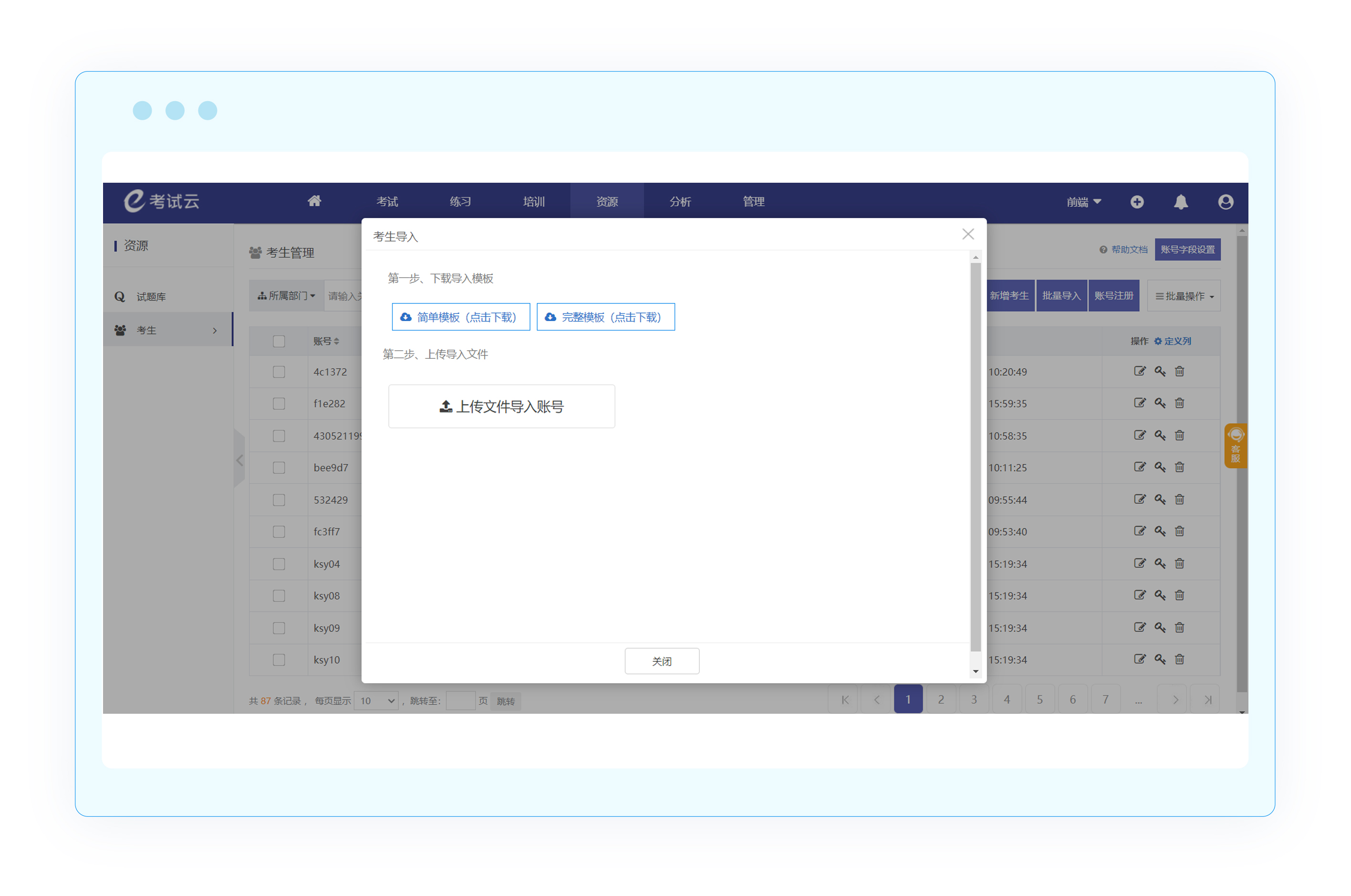 不同专业、不同年级的班级需要考试的项目都有不同。西北工业大学老师先根据已有的专业、班级在考试云的考生管理中创建分类,再下载Excel模板,将学生的学号作为账号,设定密码、填写班级分类,一键批量创建学生个人账号,每个学生的账号都放在所属的班级分类下。