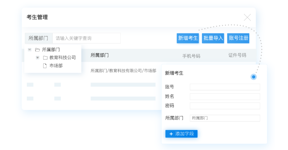 首先根据企业内部的部门和岗位创建不同的父子级分类管理员工,组建员工组织架构体系;考试云提供Excel模板批量导入和单个新增这两种快捷添加员工信息的方式。