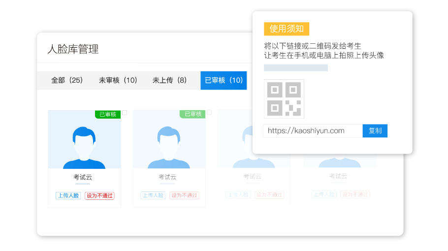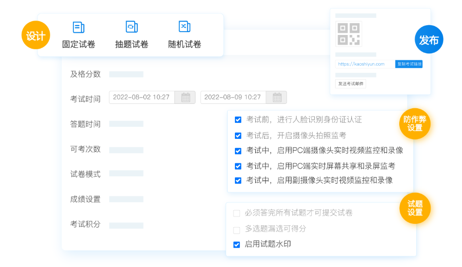 >考试云有固定、抽题、随机这三种试卷类型,固定试卷是所有学员用同一份试卷,可以打乱试题、选项顺序,防止考生之间相互传递答案;抽题和随机试卷是添加策略随机抽取试题,能够增加试卷难度,扩大知识点的考查范围;且严肃性较高的考试,系统有三路音实时视频监考并录像,实现全面的监控覆盖,保障考核的公平公正。