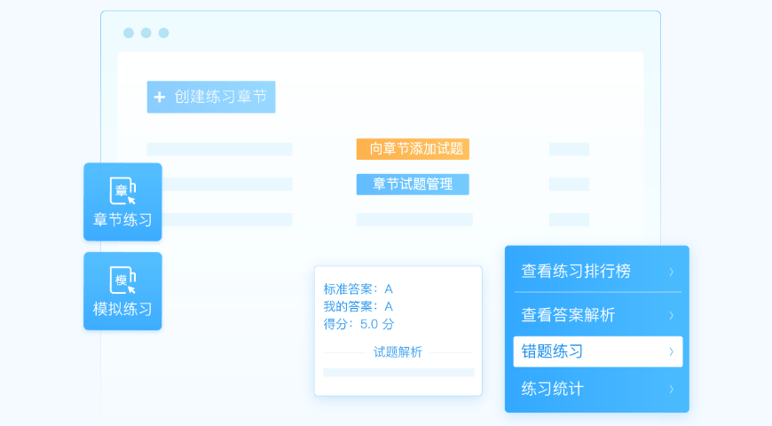 >有章节练习、模拟练习及错题练习模式;错题练习是在章节、模拟的基础上,记录学员答错的试题生成错题本来进行练习;在答题的过程中,员工可以边答题边查看试题的答案和解析,加深对于专业知识的印象和理解。
