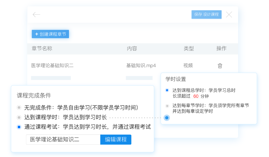 >系统有图文、视频、文档(PDF)等课件内容和不限制学时、达到课程设定学时、达到学时并通过课程考试等完成条件;员工可以在课程学习界面相互讨论,增加学习的趣味性;也可以向培训讲师发起提问,解疑答惑。