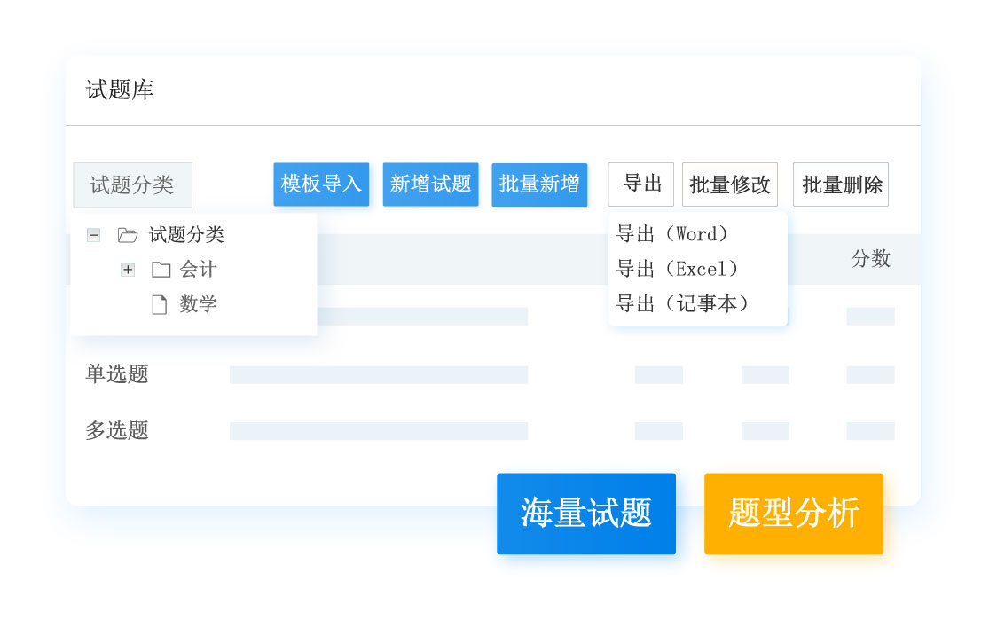 在线答题系统可以让管理员自行导入需要的试题,有多种方式提供选择,使导题工作更加简单便捷。系统可以构建多层级试题分类组织架构,分级管理试题方便设计练习页面时,能快速查找并使用。还可以通过批量操作、试题查重、预览格式来确保试题正确无误。