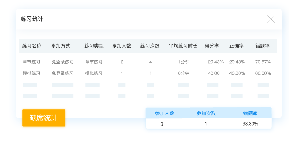 练习时间、时长、正确率、错题率等练习相关数据,在线答题系统会自动统计分析,系统后台会生成相应的报表,管理员可以直接查看了解并掌握练习、答题情况,方便计划后续的复习和学习。