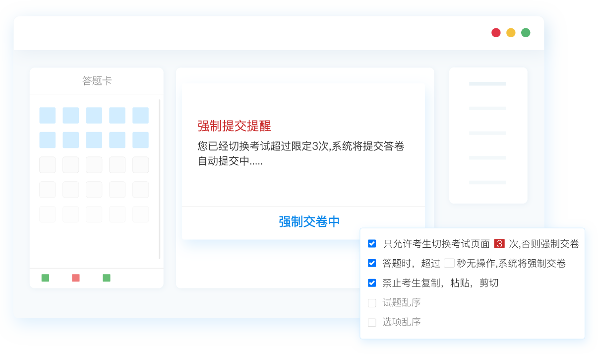 设定考生能切屏的次数和时间,防止考生频繁切屏搜索答案的作弊行为;规定考生在答题时的无操作时间,防止考生因为作弊行为而长时间没有操作。