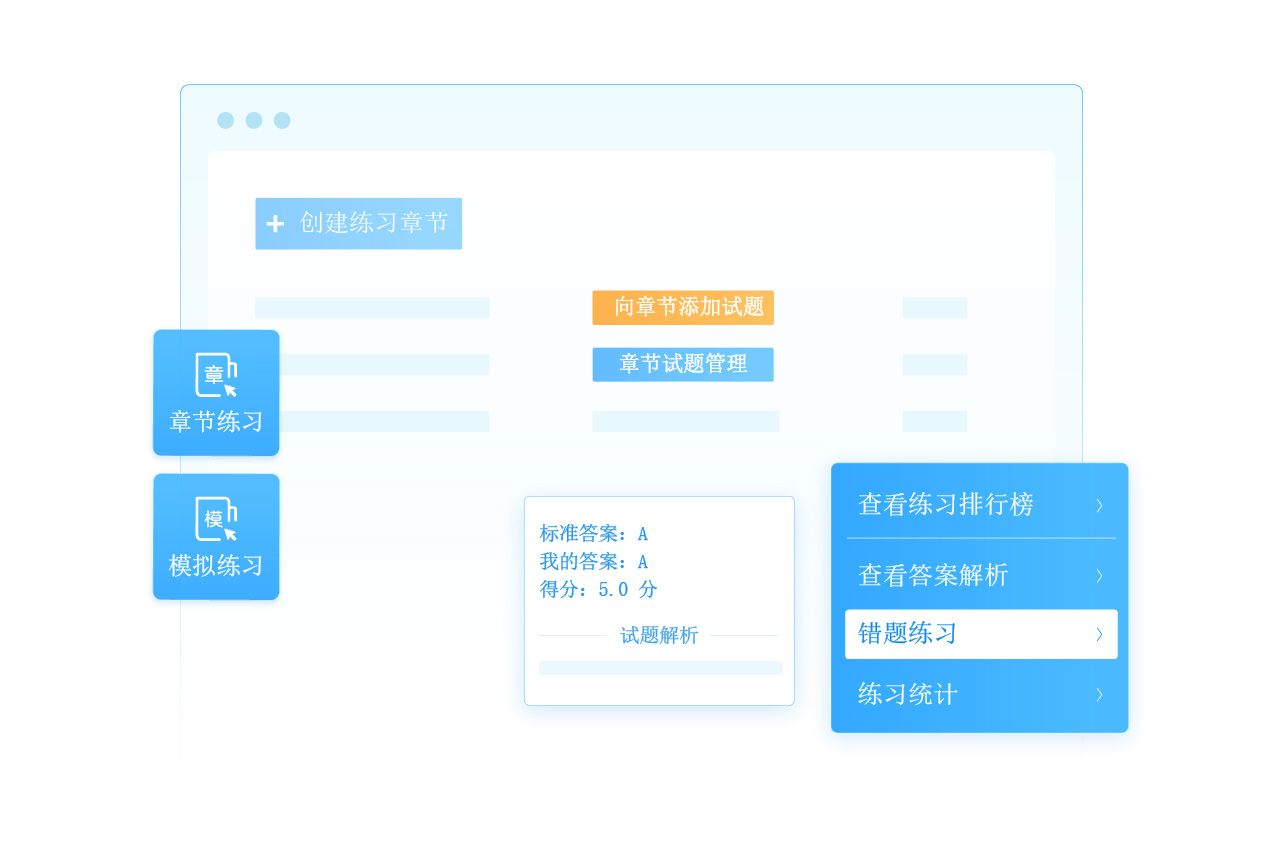 组织一场练习答题:填写练习名称和分类,选择参加练习的方式;确认练习创建模式(有章节和模拟两种练习模式),设计练习结构,添加试题,设置练习配置项,发布练习通知。