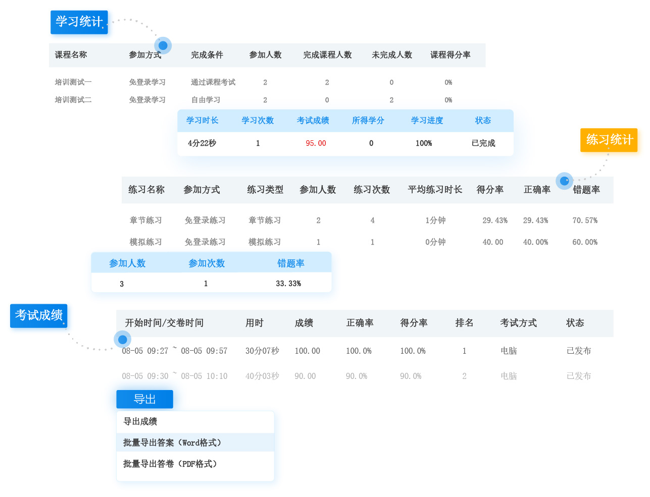 考试云在线考试系统采用了先进的数据加密技术,确保考试、课件、试题数据的安全性;采用超压缩传输技术和数据缓存技术,能让在线考试、学习更流畅;采用高可用的分布式架构,确保业务数据稳健运行。