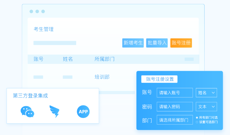 1、能按部门、岗位等分类组建组织架构,通过模板批量导入考试账号;也可以发送账号注册窗口,让考生自主填写信息注册参与考试、练习、培训的账号。