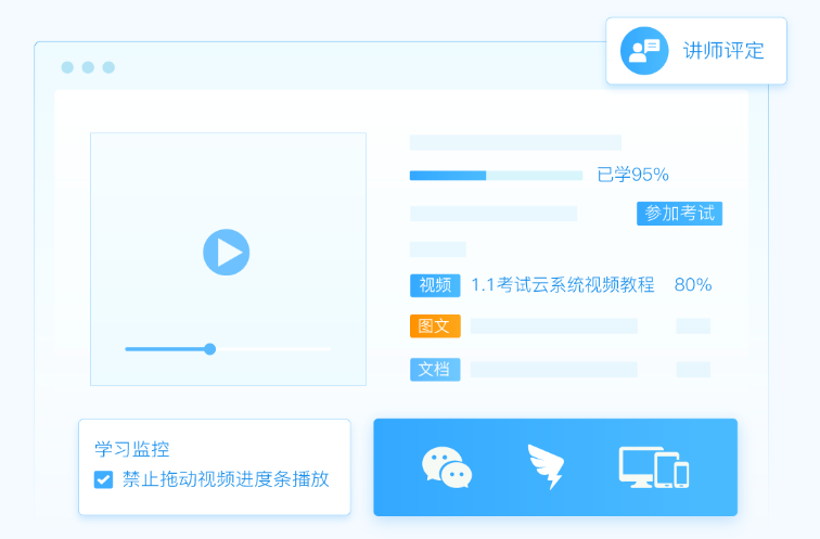 5、能上传图文、视频、文档等课件内容;有不限学时、达到学时、通过课程考试等完成条件;能禁止学员拖动培训视频的进度条播放;学员之间可以互动,提升培训乐趣;还可向培训讲师发起提问,及时答疑解惑。