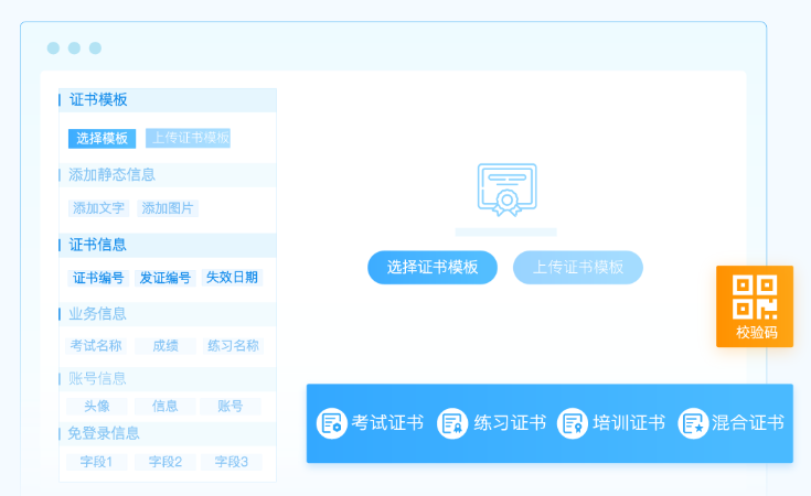 如今,考试云进行全新升级,支持自定义设计证书模板,将其与考试、练习、培训等功能结合关联,能够在线自动颁布证书。