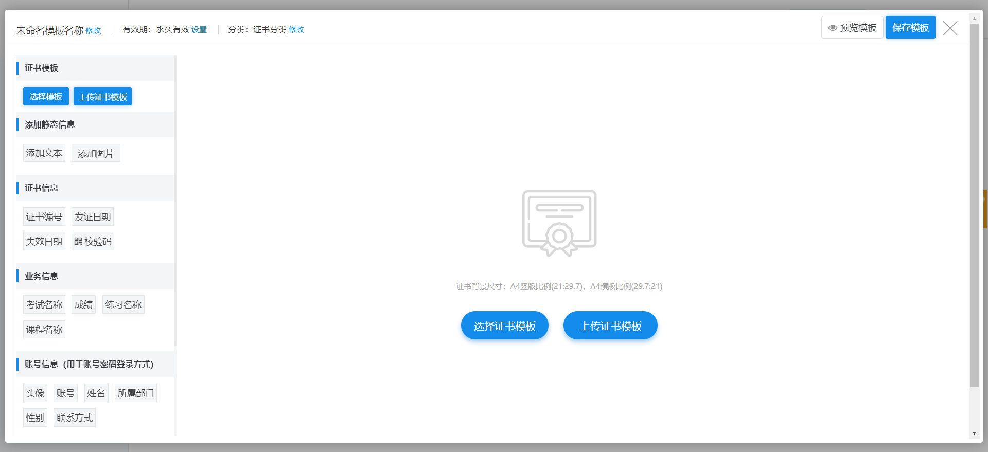 >静态信息:管理员可以添加文本或图片内容到证书模板中,文本内容可以编辑修改。