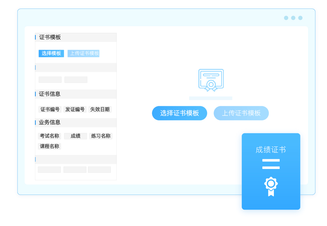 >业务信息:管理员可以添加考试名称、成绩、或者练习名称、课程名称等信息按钮,在关联考试后,系统会自动获取相关名称和数据,考生证书页面自动显示对应信息。