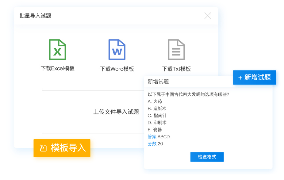 数量较多,可以使用Excel、Word、或Txt模板批量导入,在线考试系统会提供例题和整理规则,按要求整理好文档可一次性大量导入。