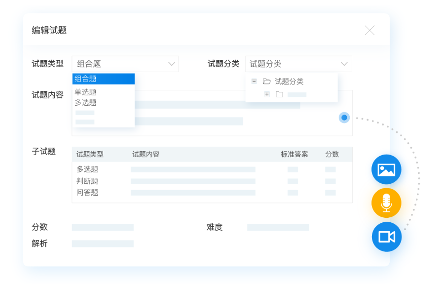 上述五种题型试题,还有组合题、音频题、代码题等题型较为复杂的试题: