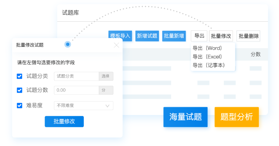 所有导入的试题,管理员能让系统根据题干内容、选项、答案来判断是否重复,重复的试题可以单个删除,或者在勾选多个试题后批量删除。如果有需要,可将列表模式的题库切换至预览模式,查看试题的完整内容和格式,减少出错的概率;还可以批量修改试题的分类、分数和难易度,或者批量导出题库试题为Excel、Word或记事本格式保留在本地。