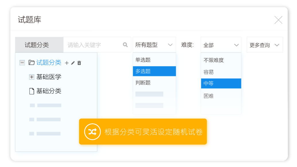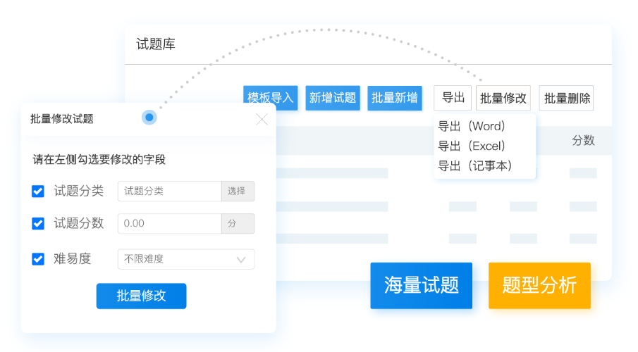 导入试题库中的试题,管理员可以批量修改试题的分类、分数和难易度,还可以批量删除不需要的试题,也可以导出所有的试题保存为Excel、Word或记事本格式到本地。批量操作可以提高管理员的工作效率。