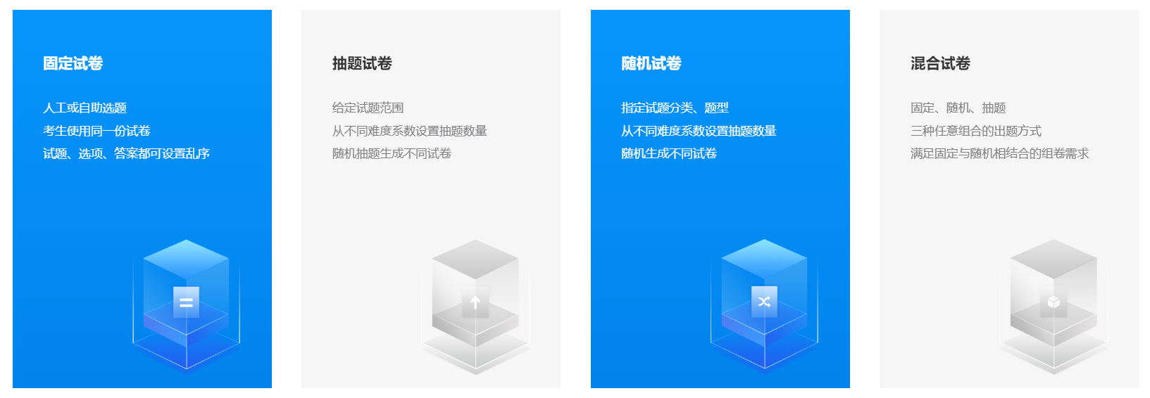 考试云有固定、抽题、随机三种试卷大题,可以自由搭配来设计试卷结构,灵活的组卷策略可以设计出满足各类科目考试需求的试卷。