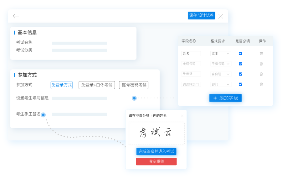 HR在创建考试时,选择免登录参加方式,然后自定义添加想要收集的信息字段,如证件号、联系方式、学历等。
