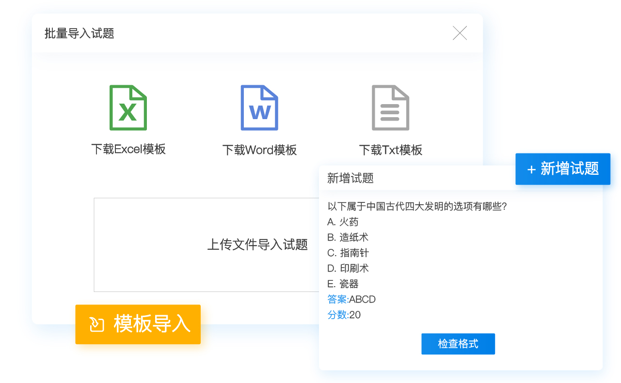 在考前筹备工作期间,管理员可以使用考试云的模板导入、批量新增、单个新增添加试题并可对考试试题进行智能管理,如:树形结构创建试题分类、批量修改、批量删除、批量导出及预览、查重试题。