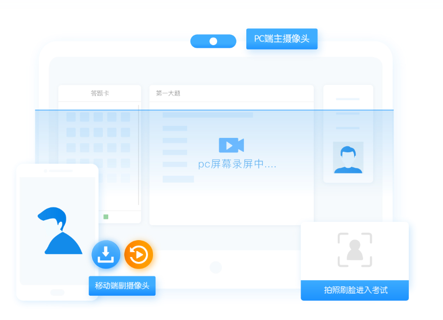 考生使用手机、电脑、pad等设备通过考试二维码、链接参加考试,在考试的过程中,考试云不仅可以通过三路音视频实时监控考生正面、侧面及答题屏幕的状态,还有一些限制答题操作的措施防止考生切网页搜答案、抄袭等行为。