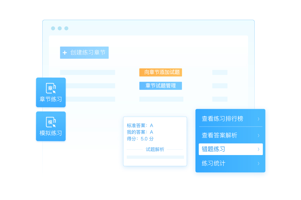 在线答题系统有章节练习和模拟练习两种练习模式可以创建,分别可以满足章节专项练习、模拟考试形式练习的需求。答题时,学员不仅可以实时查看到试题的正确答案和解析,还能在结束练习后,进行错题练习,巩固错题知识点。