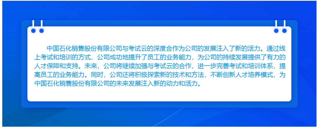 中国石化销售股份有限公司与考试云的深度合作为公司的发展注入了新的活力。通过线上考试和培训的方式,公司成功地提升了员工的业务能力,为公司的持续发展提供了有力的人才保障和支持。未来,公司将继续加强与考试云的合作,进一步完善考试和培训体系,提高员工的业务能力。同时,公司还将积极探索新的技术和方法,不断创新人才培养模式,为中国石化销售股份有限公司的未来发展注入新的动力和活力。