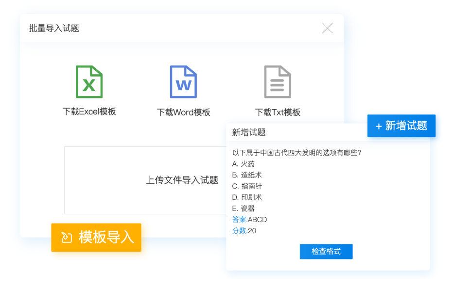 模板导入:系统提供Excel、Word和Txt三种模板,管理员可以根据需要下载对应模板,然后按照系统的模板规则整理试题,就可以在系统中一键大量导入题库中。
