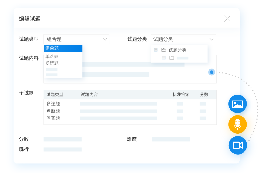 新增试题:系统中有单独添加试题的功能,管理员可以在纯文本或编辑器模式下增添试题,其中编辑器模式下,可以在试题中添加图片、音频、视频等内容再导入。