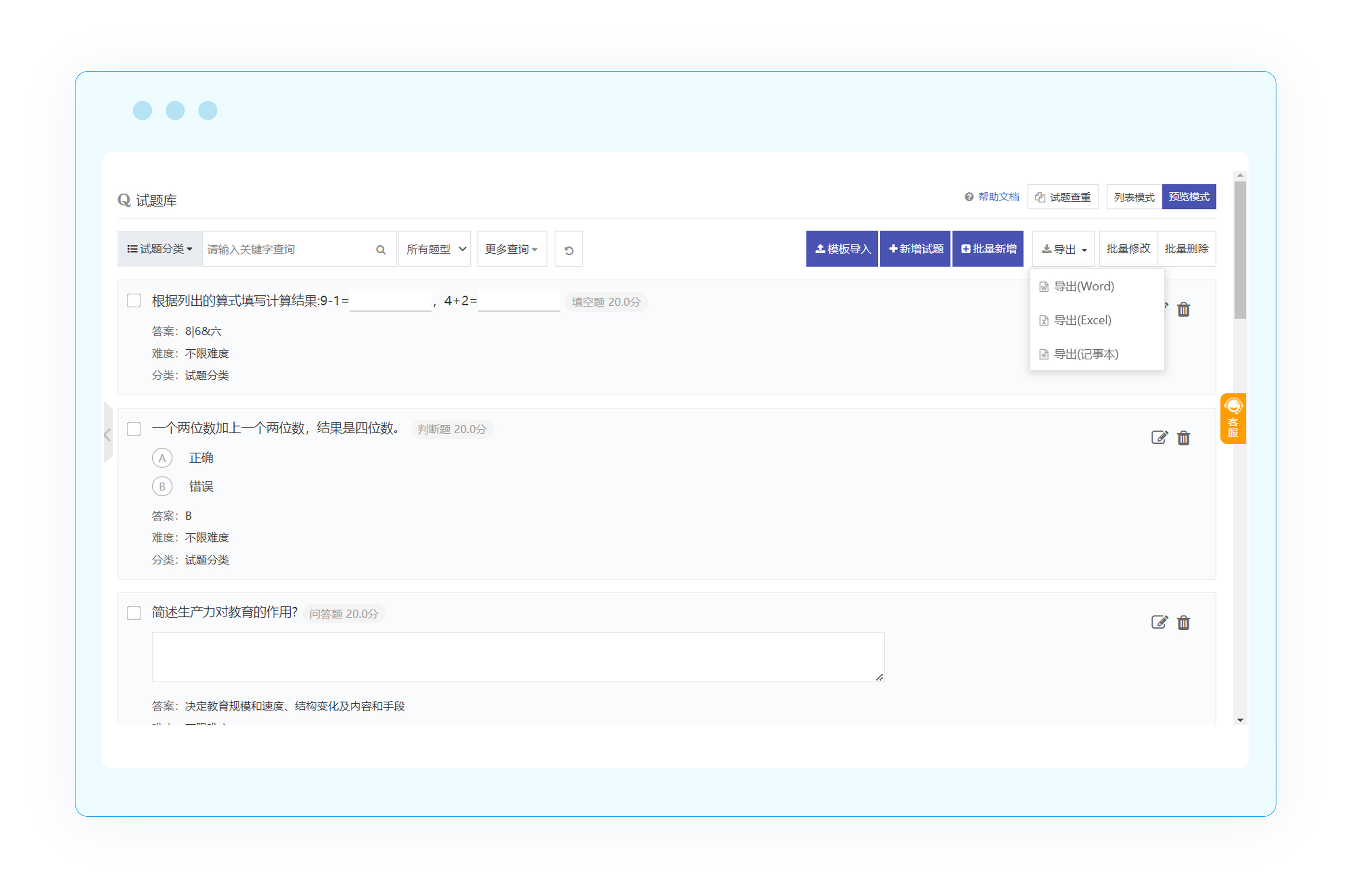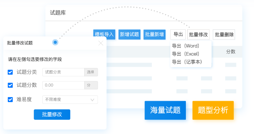 管理员可以在系统中使用批量修改、批量删除、导出等功能,让管理员的操作可以更加简单高效,提高整个管理效率。其中可以批量修改试题的分类、分数和难易度;可以导出题库中的试题为Excel、Word或记事本,保留在本地。