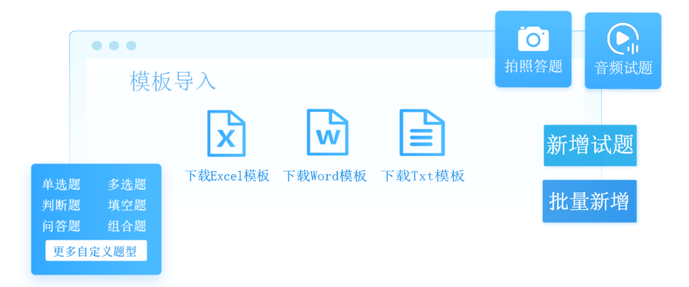 首先,在线考试系统可以自建题库支撑笔试组卷,能够对试题的题型、难度、属性分类等进行严格细分。系统支持多种导题方式和题型,有模板导入、批量新增、单个新增等添加试题方式,支持的试题题型覆盖了单选、多选、判断、填空、问答、图片、音视频、组合等。