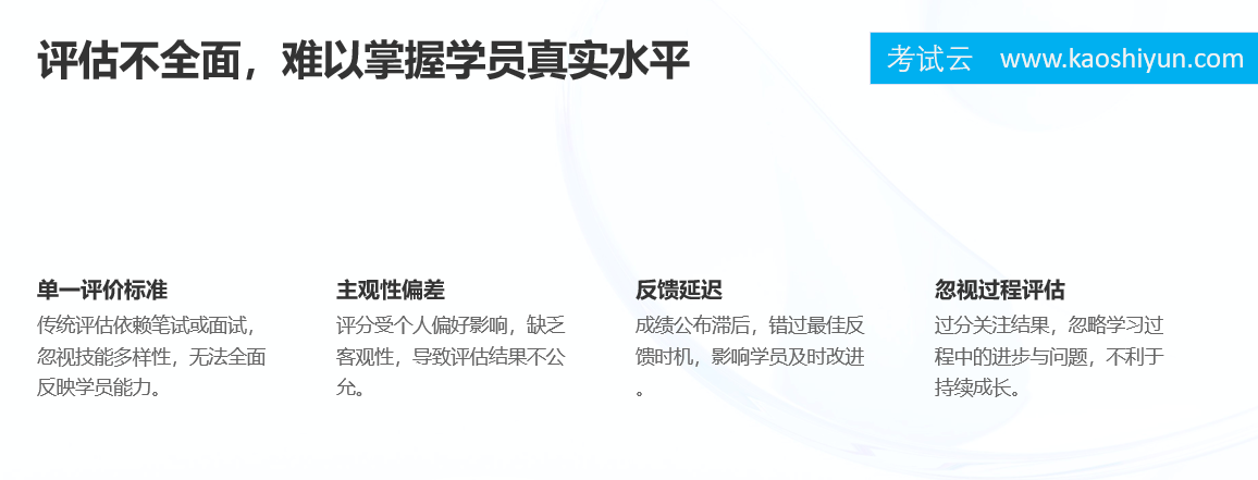 这些痛点不仅影响培训效果,更直接关系到组织人才竞争力的构建。而考试云,正是为破解这些难题而生。