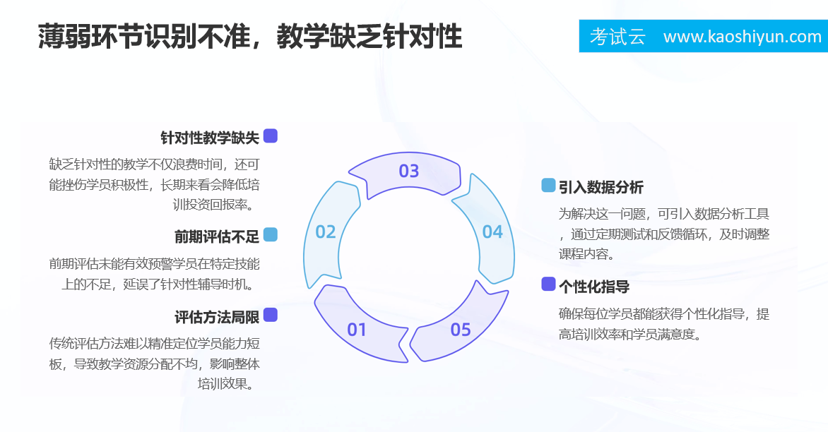 它让评估更全面,让教学更精准,让反馈更及时,让学习更主动。通过数据驱动的闭环管理,考试云帮助企业实现: