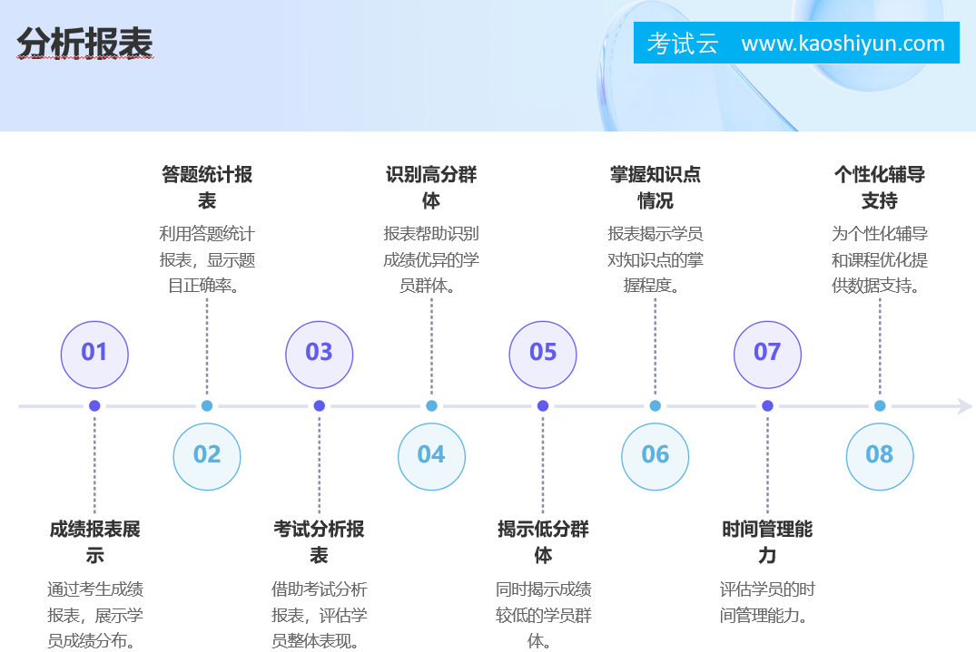 基于对培训场景的深度理解与技术创新,考试云提供了一套覆盖“出题—考试—判分—分析—反馈—提升”全链条的智能化解决方案,真正实现“以考促学、以评促教”。