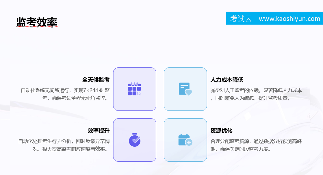 考试云凭借其强大的技术优势,在考试管理的各个环节均展现出卓越的效能,极大地提升了考试的公平性、安全性和可追溯性。首先,从防作弊能力来看,考试云通过人脸核验、三路音视频监控和AI智能监考的多重防护机制,构建了严密的防作弊体系。相比传统考试依赖人工监考的方式,考试云能够实时监测考生行为,精准识别各种潜在作弊行为,并自动记录存证,大幅降低人为疏漏带来的风险。