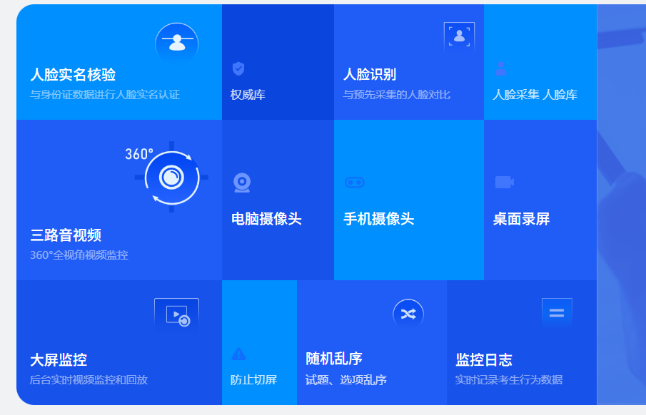考试云依托先进的人脸核验、三路音视频监控及AI智能监控技术,构建了一套高效、精准的在线考试监管体系,为严肃性考试提供强有力的技术保障。