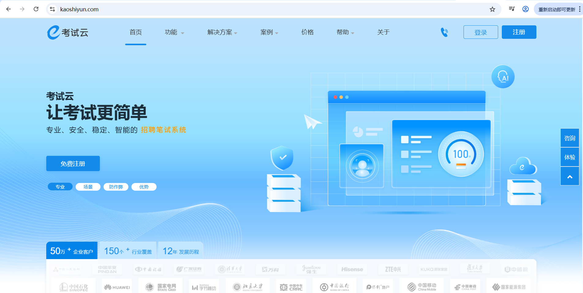 考试云(kaoshiyun.com)是长沙众诚泰合信息科技公司旗下一款专业的在线考试系统产品,考试云正是在线考试系统的典型代表。其核心定位是为各类组织提供一站式的在线考试、练习、培训、作业、竞赛及笔试解决方案,凭借智能易用、安全稳定、专业可靠的核心优势,赢得了市场的广泛认可,目前已服务超过55万+企业客户,其中不乏中国中车、北京大学、中国科学院、中国石油、网易、新东方、金山软件、中国人保、中国银行等标杆客户,在业界形成了良好的口碑传递效应。