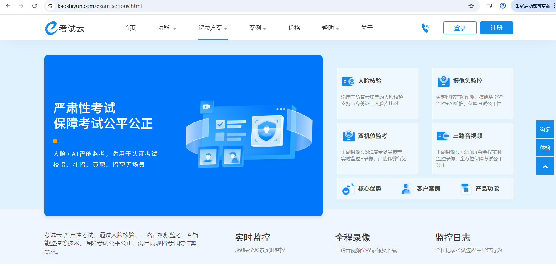 “公平性” 是在线考试的核心诉求,也是传统线上测评的最大短板 —— 代考、切屏搜索、多设备协同作弊等问题,曾让许多企业与机构对在线考试望而却步。考试云通过 “身份核验、环境监控、行为识别” 三重防作弊体系,将公平性做到 “比肩线下甚至超越线下”,其技术方案已在公务员招录、职业资格认证等严肃性考试中验证有效。