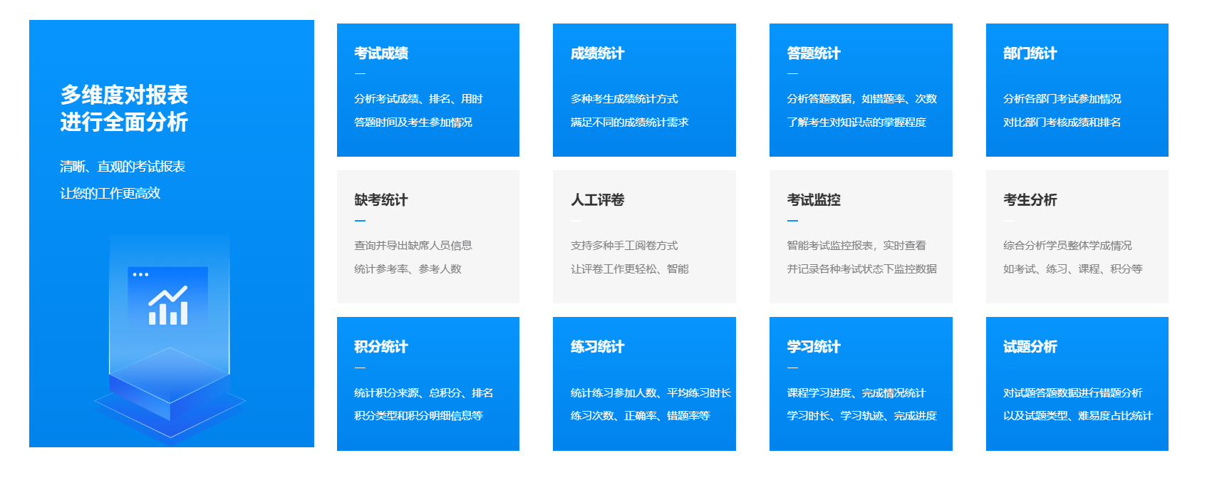 考试云生成 20 余种可视化报表,覆盖 “考生、试题、考试、练习、培训” 全场景: