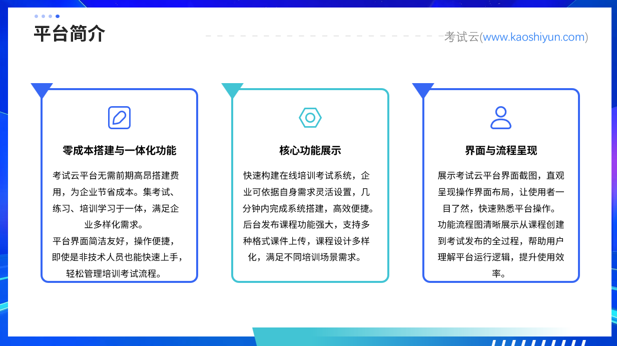 考试云平台拥有丰富的课程资源,涵盖了各个行业和领域的知识和技能。企业可以根据自己的需求,在平台上选择适合自己的课程资源,为员工提供在线培训和学习支持。