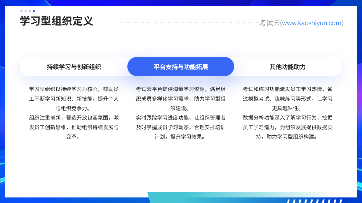 考试云平台可以为学习型组织的构建提供有力的支持。首先,通过平台上的课程发布和设计功能,企业可以为员工提供丰富的学习资源和多样的学习方式,以满足员工的学习需求。其次,通过实时跟踪学习进度和自动统计学习成绩等功能,企业可以及时了解员工的学习情况,并对员工的学习效果进行评估和反馈。最后,通过平台上的交流和互动功能,员工可以与其他同事分享学习心得和经验,促进知识共享和团队协作。